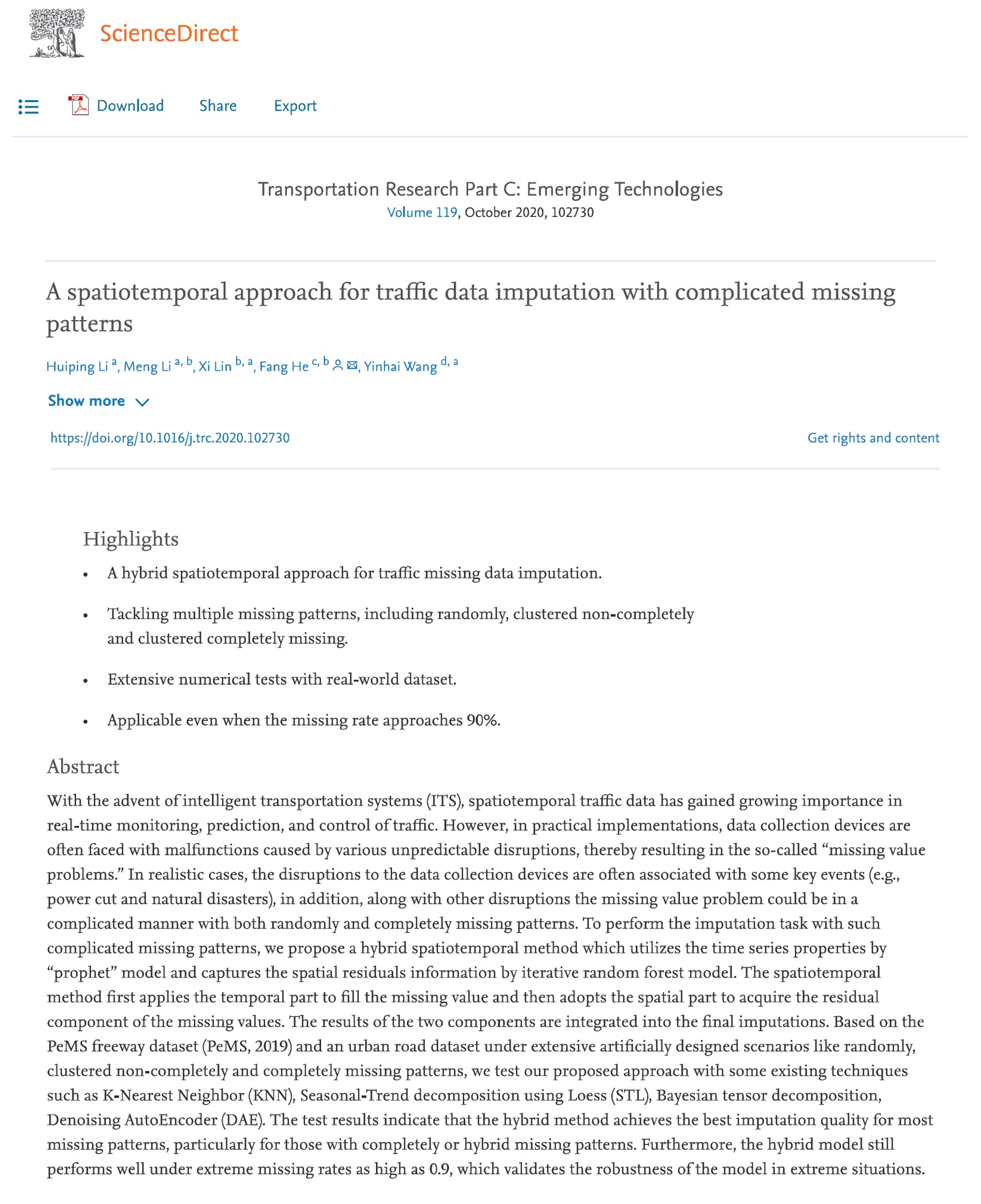 2020年9月,THU-LEAD李会平博士的研究论文“A spatiotemporal approach for traffic data imputation with complicated missing patterns(一种处理复杂缺失模式的交通数据时空填补方法)” 被Transportation Research Part C: Emerging Technologies接收。