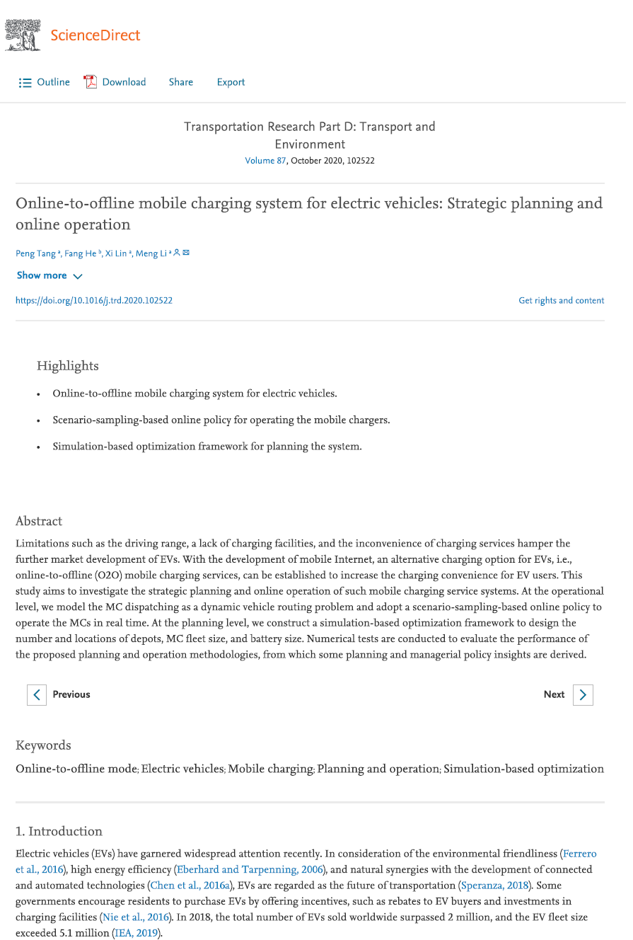 2020年10月,THU-LEAD汤鹏博士的研究论文“Online-to-offline mobile charging system for electric vehicles: Strategic planning and online operation(电动汽车移动充电系统:战略规划与在线运营)” 被Transportation Research Part D: Transport and Environment接收。