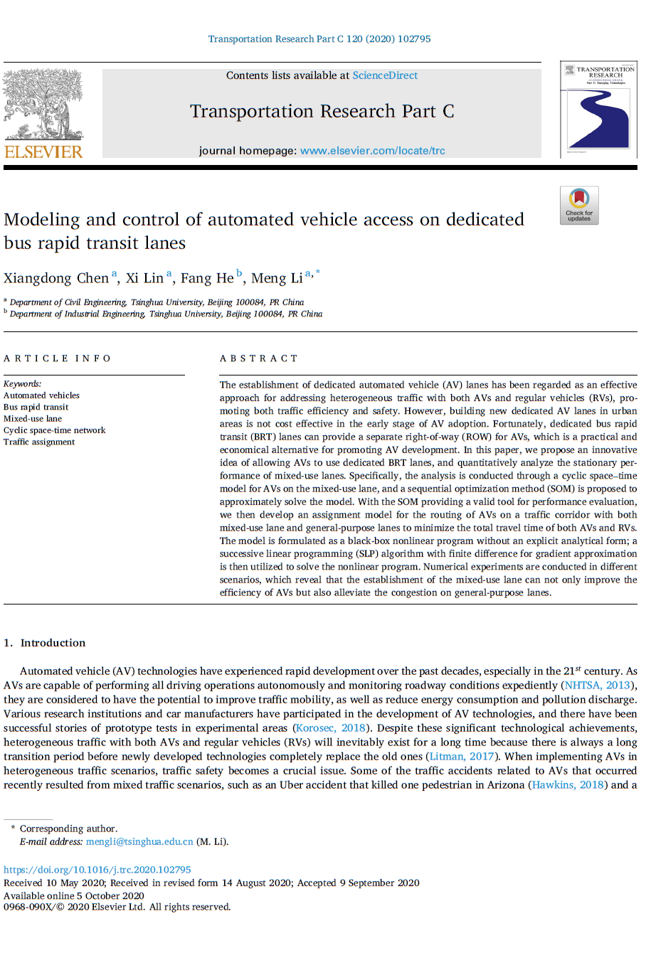 2020年9月,THU-LEAD陈湘冬博士的研究论文“Modeling and Control of Automated Vehicle Access on Dedicated Bus Rapid Transit Lanes(BRT / AV混用车道建模与控制)” 被Transportation Research Part C: Emerging Technologies接收。